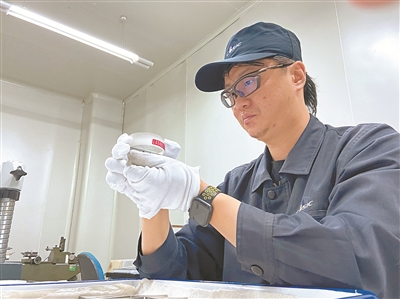 叶辉正在进行量块修理工作。