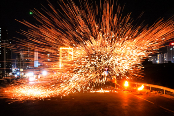 打铁花,如同绚烂的烟花雨,场面颇为壮观。