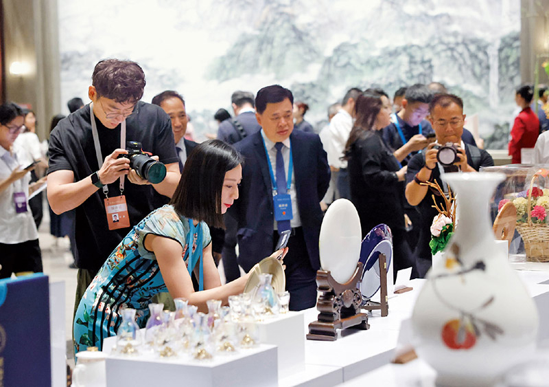2024年7月10日,第十届尼山世界文明论坛在山东曲阜尼山开幕。本届论坛以“传统文化与现代文明”为主题,旨在“践行全球文明倡议、弘扬全人类共同价值、推动构建人类命运共同体”,还设置“全球挑战下的文明交流互鉴”等6个分议题。图为论坛开幕当日,展出的山东好品吸引宾客驻足欣赏。 山东省委宣传部供图 王世翔 摄