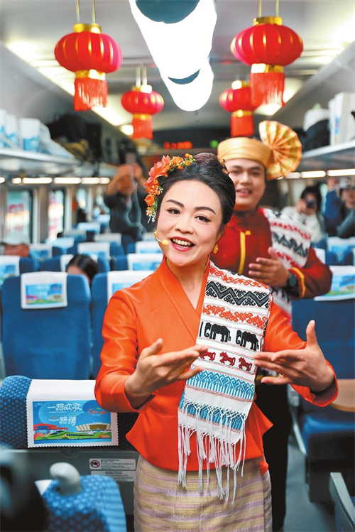 中国昆明、玉溪、普洱、西双版纳;老挝琅勃拉邦、万荣、万象……车外,美景流转,车内,欢声笑语……活动以行进中的列车为舞台,为乘客们端出精彩的跨国文化“大餐”。《铁路畅联中老情》《老挝之声》《走进中老铁路沿线世界遗产》《丢包情歌》《坐着火车去老挝》等50余个精彩节目在车厢内轮番登场,持续4个多小时的演出引得乘客们掌声和笑声不断。