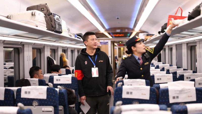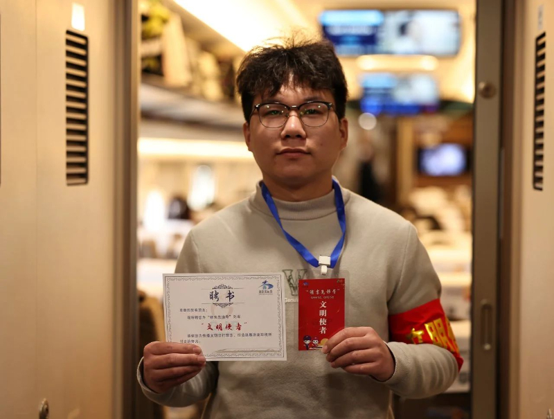 1月20日,乘坐D134次“井冈山号”列车的人民教师张老师响应列车长赵宝丹的邀请,成为了本趟列车第一位“文明使者”,随即佩戴“文明使者”袖标的张老师与列车工作人员共同开启了一趟文明之旅。