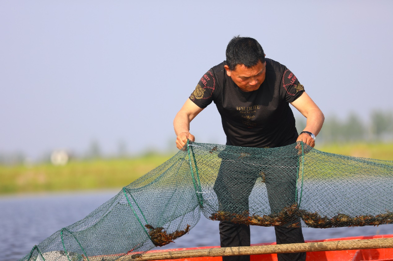 4月21日,在中国•稻虾乡里产业示范基地,永修县当地虾农在收获小龙虾。(永修县三角乡供图)