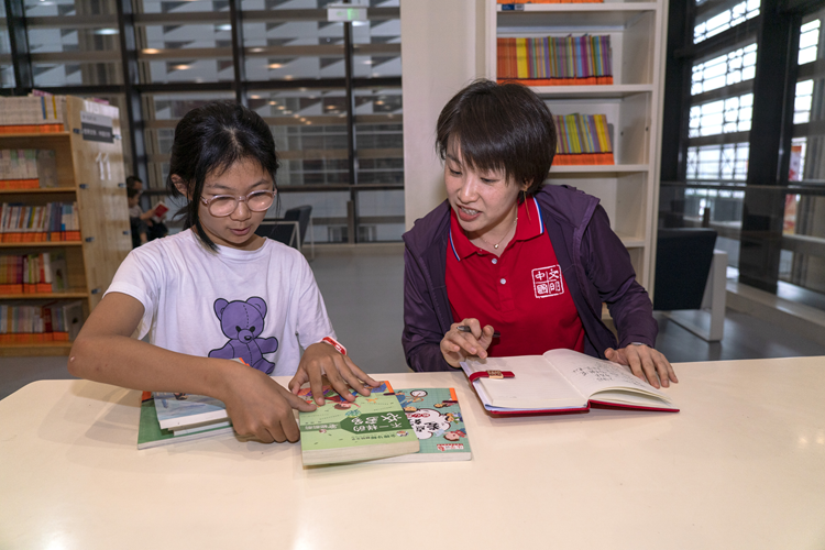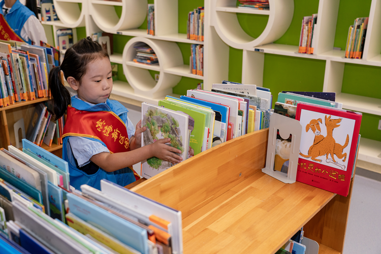 9月24日,小志愿者正在图书馆里进行志愿服务,帮助图书管理员整理书架、摆放书籍。新华网 钟奕 摄