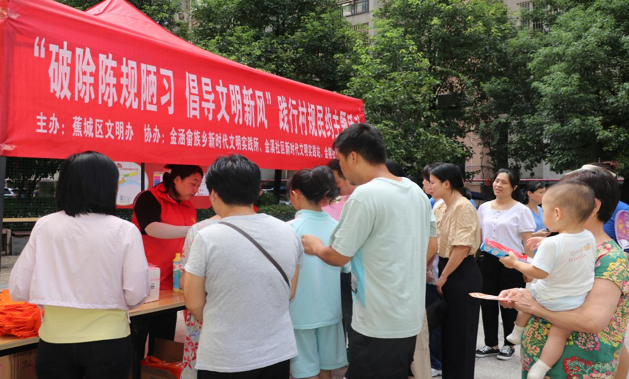 “我们依托村民议事会、红白理事会、道德评议会、禁毒禁赌协会、老年人协会等,组建了专兼职结合的社会化宣讲队伍,以引导村民破除铺张浪费和陈规陋习,树立勤俭节约、文明健康的生活方式。”金涵村党支部书记介绍道。目前,金涵畲族乡已组建7支新时代文明实践志愿服务队伍,共计500余人,积极推广“婚事新办、丧事简办、其他不办”的文明理念,常态化开展理论政策宣讲、传播文明理念、弘扬时代新风等志愿服务活动,进一步凝聚群众的思想共识和价值追求。2023年,金涵畲族乡共开展移风易俗活动60余场次,受众近2万人次。同时,金涵畲族乡还修订完善村规民约,通过微信群推送移风易俗典型案例等方式,线上线下齐发力,教育成效显著。