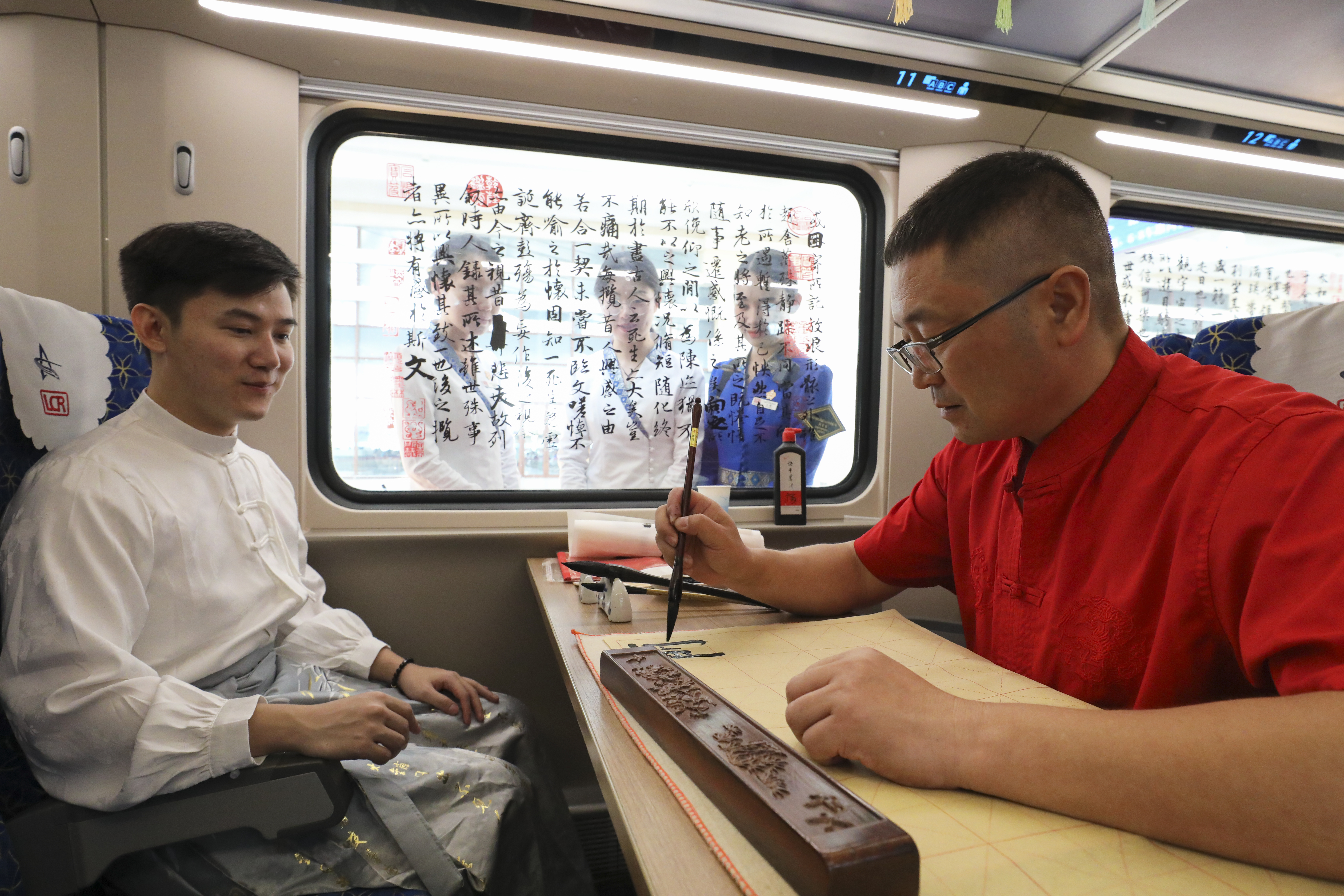 中老铁路D88次国际旅客列车5号车厢被装扮一新,两幅25米长的《兰亭集序》书法长卷高挂在车厢顶部,古色古香的中国书法作品挂画在车厢内随处可见。乘客在座位上专注地用毛笔一笔一画写下中国汉字,浓浓的文化气息弥漫在车厢的每个角落……