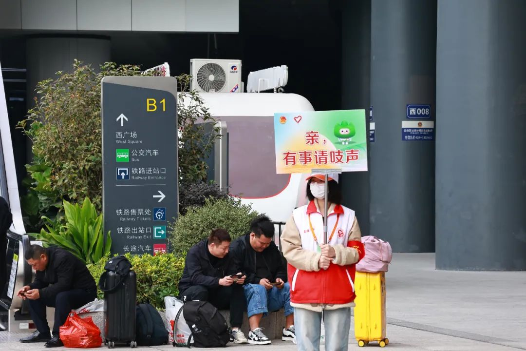 广州白云站内,志愿者们身着红马甲、高举指引牌,用实际行动保障旅客顺畅出行。