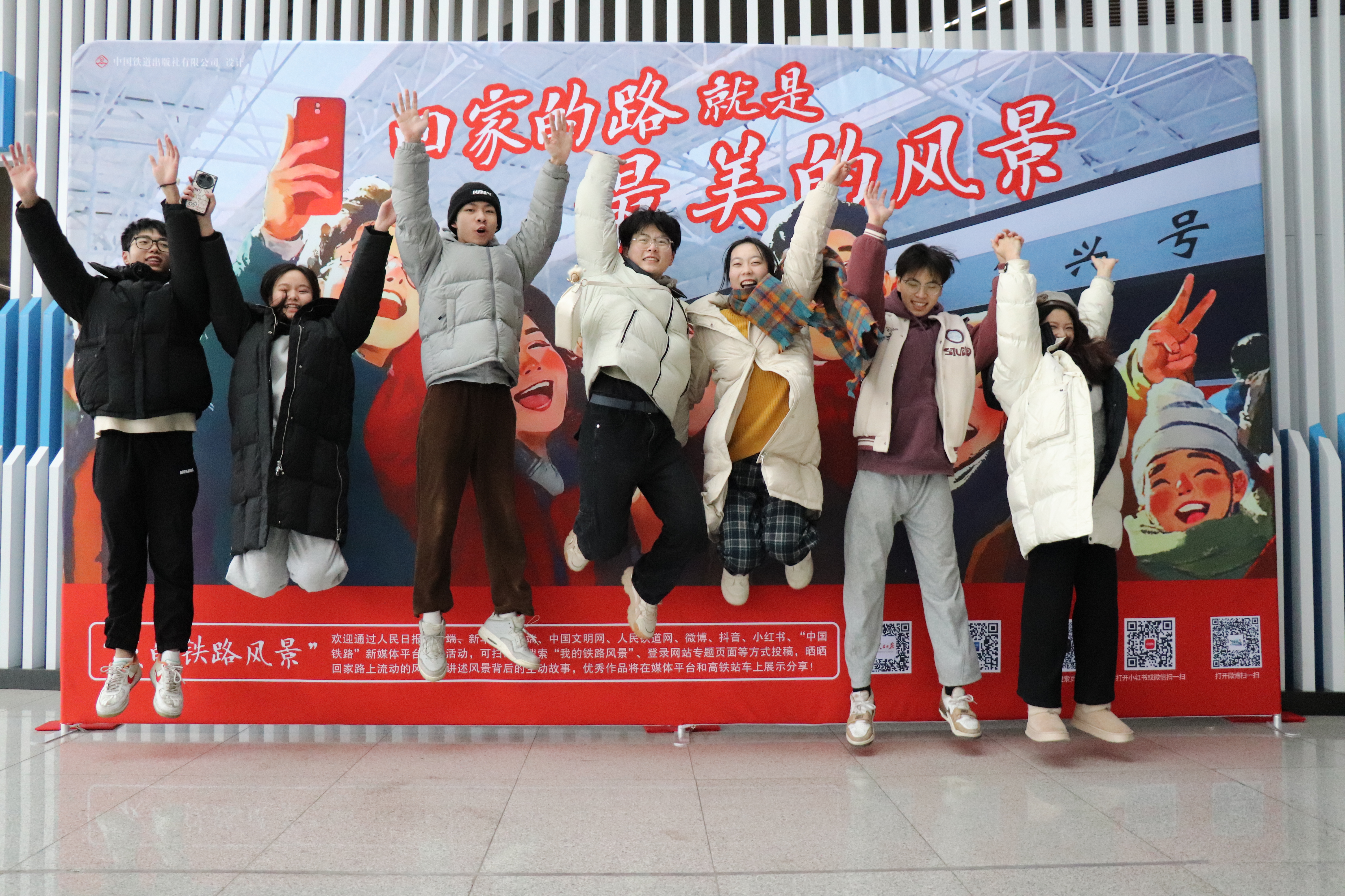 春运期间,青岛北站迎来大批乘客,大家纷纷在“我的铁路风景”主题活动现场合影留念。